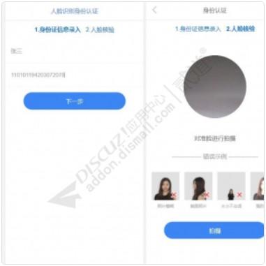 Discuz人脸识别实名认证 优惠版,『小蚂蚁』人脸识别实名认证,借助强大的百度智能人脸识别API完成实名认证,完美与论坛实名认证系统结合。 插件简介: 1.后台可设置百度API key、秘钥 2.后台可查看用户实名认证的信息 3.实名认证通过即论坛实名认证自动通过 4.实名认证通过自动将姓名、身份证号写入论坛用户信息内 5.调用摄像头实时拍照人脸识别完成认证 重