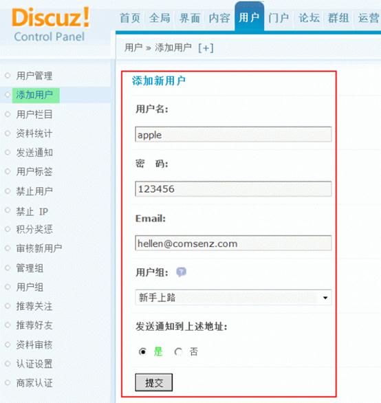 用户组:为新添加的用户设置一个初始用户组,可以是新手会员用户组,也可以是管理组(示例中为:新手上路组);