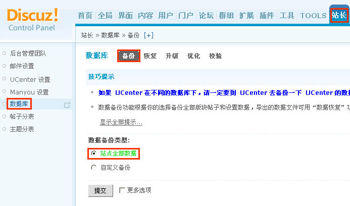 虚拟主机用户推荐直接在站点后台进行备份,用管理员登录 Discuz! X3.0 后台 => 站长 => 数据库 => 备份:推荐备份“站点全部数据”,如图: