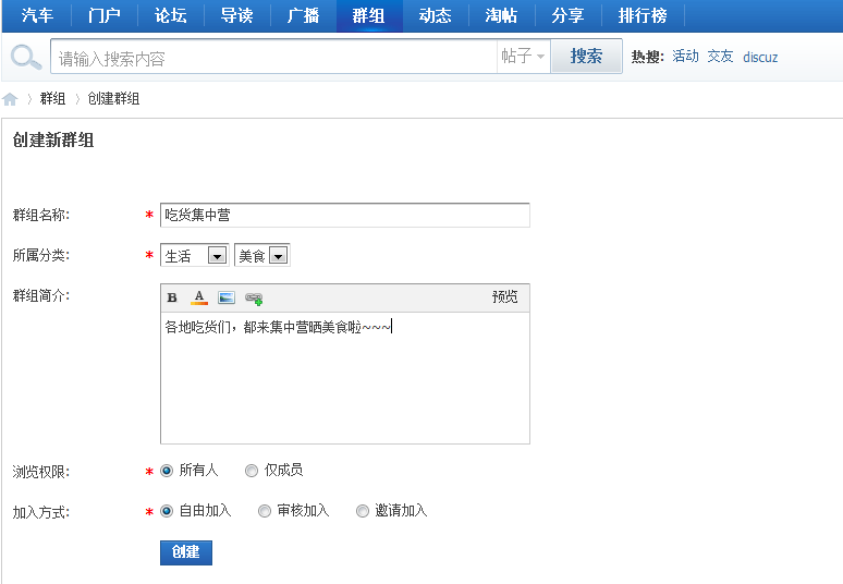 输入群组名称(最多20字节,超过将被截断),选择归属分类,填写简介设置浏览权限与加入方式,点击创建提交即可,成功后将会跳转到群组管理页面,可以接着设置群组顶部的图片和群组图标来彰显群组特色