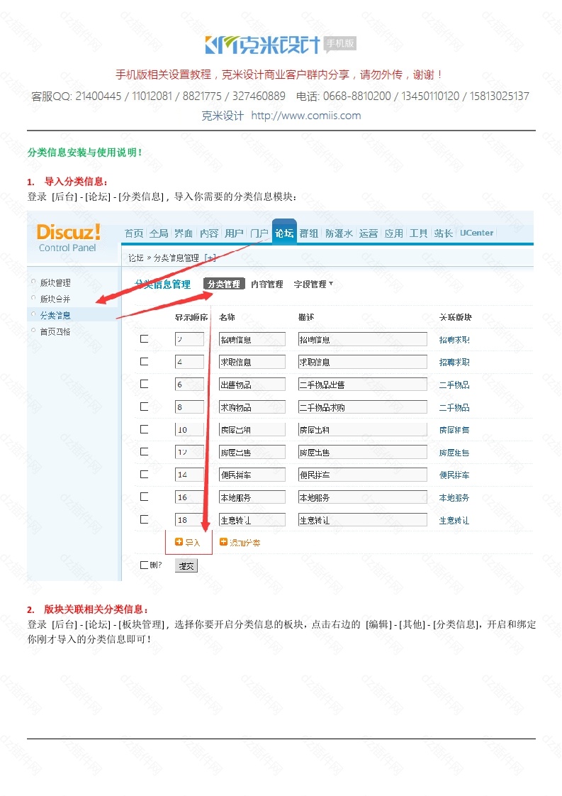 手机版相关设置教程,克米设计商业客户群内分享,请勿外传,谢谢!客服QQ:21400445/11012081/8821775/327460889电话:0668-8810200/13450110120/15813025137克米设计htp:/www.comiis..com分类信息安装与使用说明!1.导入分类信息:登录[后台]-[社区]-[分类信息],导入你需要的分类信息模块:Discuz!首页仝局界血内容用户门户社区Control Panel分类管理内容管理名称4求职信息招聘末职6出售物品二手物品出售二手物品14便兵拼车便民样车16本地服务本地那务本地那务182.版块关联相关分类信息:登录[后台]-[社区]-[板块管理],选择你要开启分类信息的板块,点击右边的[编辑]-【其他]-【分类信息],开启和绑定你刚才导入的分类信息即可!Discuz!L3.开启手机模板的分类信息效果:完成以上步骤,分类信息安装完成!附加:分类信息中地区名字和其他相关内容修改!请参照下图步骤打开修改即可:Discuz!n上0◇0P5:如需修改或定制个性化分类信息可与克米设计在线客服联系咨询,谢谢!感谢您的支持,祝您使用愉快!克米设计http://www.comiis.com