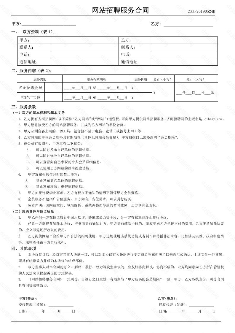 网站招聘服务合同ZXZP20190524B甲方:乙方:一、双方资料(表1):甲方:乙方:联系人:联系人:电话:电话:通信地址:通信地址:二、服务内容(表2):服务类别服务有效期限服务价格总计(小写)总计(大写)名企招聘会员年月日¥仟佰拾元招聘广告位年月日至年月日三、服务条款(一)双方的基本权利和基本义务1、乙方拥有齐河招聘网(以下简称“乙方网站”或“网站”)运营权,可向甲方提供网络招聘服务。齐河招聘网的主域名是:qihezp.com。2、甲方愿意接受乙方的网站招聘服务,并成为乙方网站的单位会员。3、甲方必须自备上网的一切工具,包含但不至于电脑、宽带(或拨号上网)等。4、乙方网站的单位会员资格具有期限性(具体见网站会员套餐),甲方根据自己需要选购“会员期限”。5、在会员有效期内,甲方享有以下权益:A.可以随时发布自己单位的招聘信息。B。可以随时修改自己单位的招聘信息。C.可以查看向自己求职的个人会员详细信息。D.可以使用乙方网站的站内搜索功能。6。甲方发布招聘信息时的禁止事项:A.禁止发布其它单位的招聘信息。B.禁止发布违法、虚假招聘信息。7.甲方如果违反禁止事项,乙方有权在不通知的情形下暂停甲方会员资格。8.会员服务不包括广告位服务。甲方如有广告位需求,可以另行购买。9。免责声明:因网站空间、域名解析、系统调整而导致的暂时故障,乙方享有免责权。(二)违约责任与协议解除1.甲乙任何一方在协议履行中采用欺诈、胁迫或暴力等手段,另一方有权立即终止履行协议。2。任意一方欲提前解除本协议,应书面提前通知对方,甲方提前解除协议的,无权要求乙方返还支付的费用,乙方无故解除协议的,应立即返还所收取的费用。3.乙方提供网站平台给甲方作合法的招聘使用,甲方违规使用该系统功能或者制作和传播非法内容,比如涉及宗教、政治和色情等,法律责任由甲方自行承担。四、其他事项1.本协议签订后,经双方当事人协商一致,可以对本协议有关条款进行变更或者补充但应当以书面形式确认,上述文件一经签署,即具有法律效力并成为本协议的组成部份。2.双方当事人对本合同的订立、解释、履行、效力等发生争议的,应友好协商解决。协商不成的,双方均同意向乙方所在管辖权的人民法院以提起诉讼的方式解决。3.《网站招聘服务合同》一式两份,自签订之日生效,有限期与“甲方购买的会员期限”一致,甲方、乙方各执壹份,两份合同具有同等法律效力。甲方(盖章):乙方(盖章):授权代表(签署):授权代表(签署):日期:年月日日期:年月日
